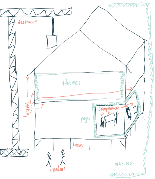 Wenn man diese Struktur anhand eines Hauses erklären möchte, dann folgendermassen: Betonmischer, Bauarbeiter und einen Kran sind "abstracts". Das Fundament ist "base", "layout" die Wände und das Dach und "components" die Inneneinrichtung. Ein Raum wäre in "pages" und ein Stockwerk in "themes" definiert. Der Hersteller wäre "vendors" und "main.scss" die Bauanleitung. Als begabter Künstlersohn würde das so aussehen: